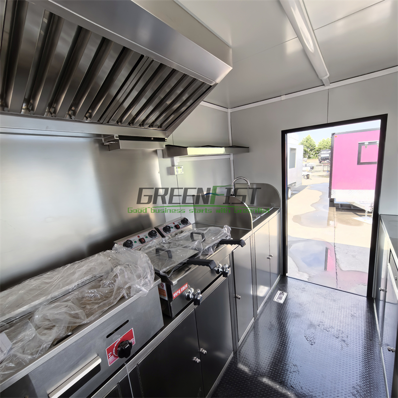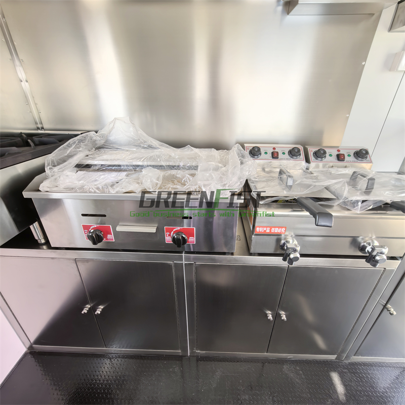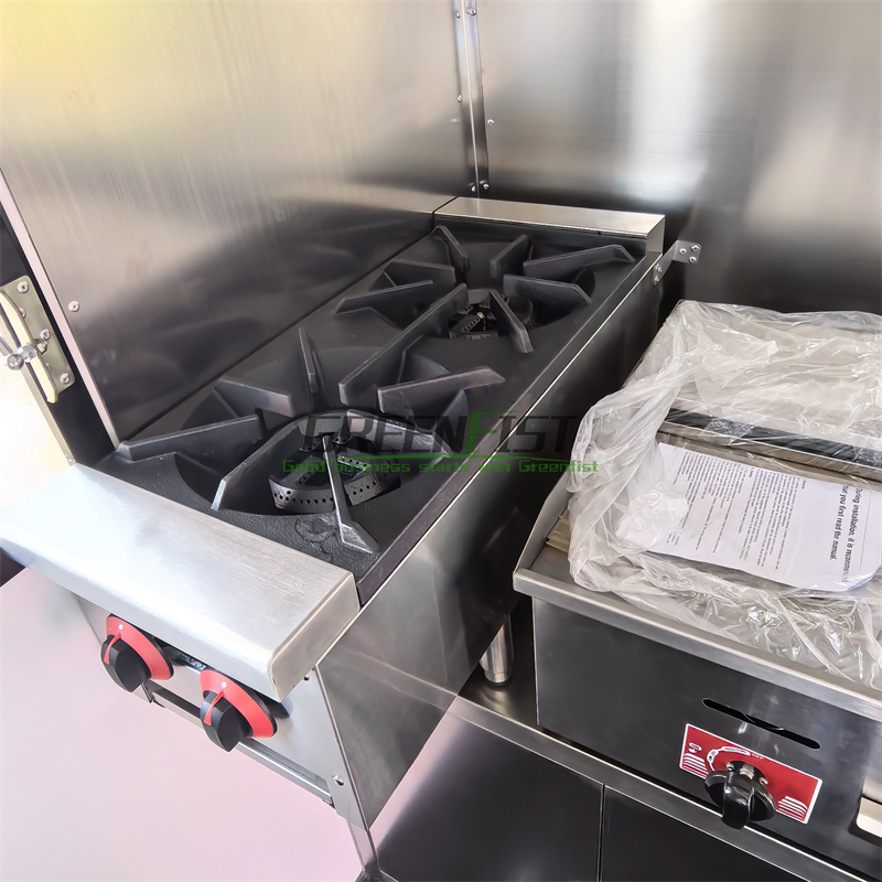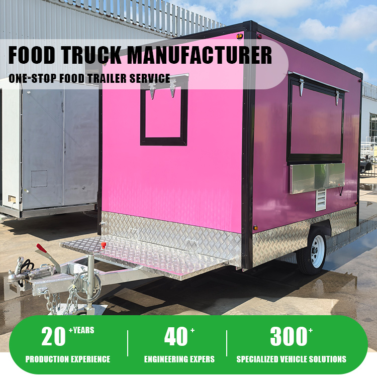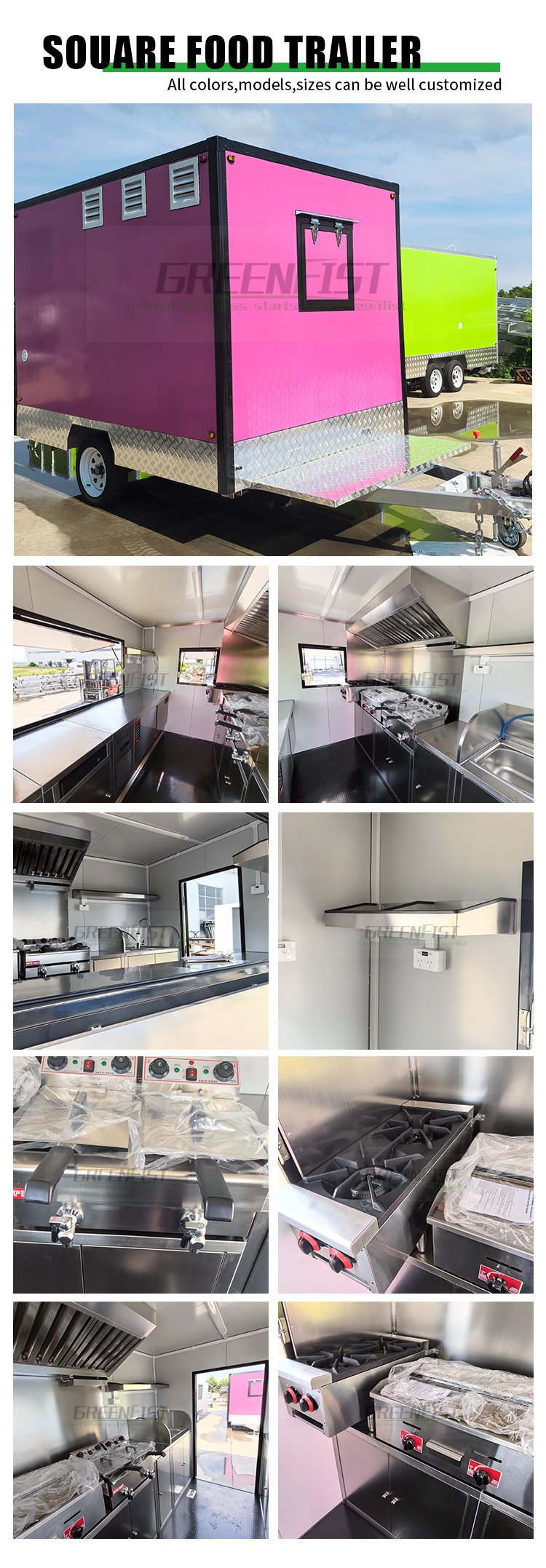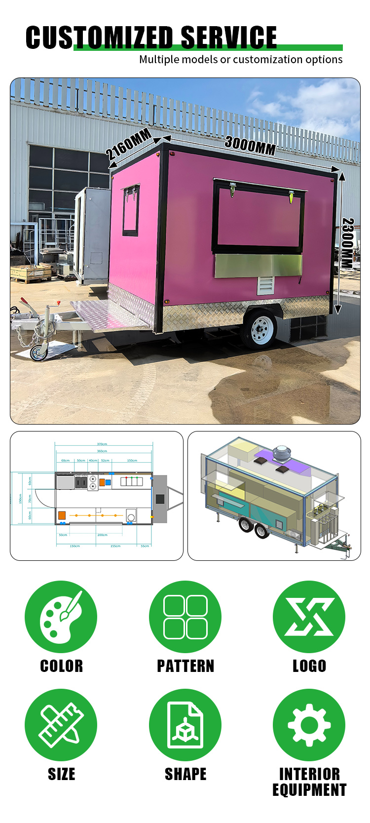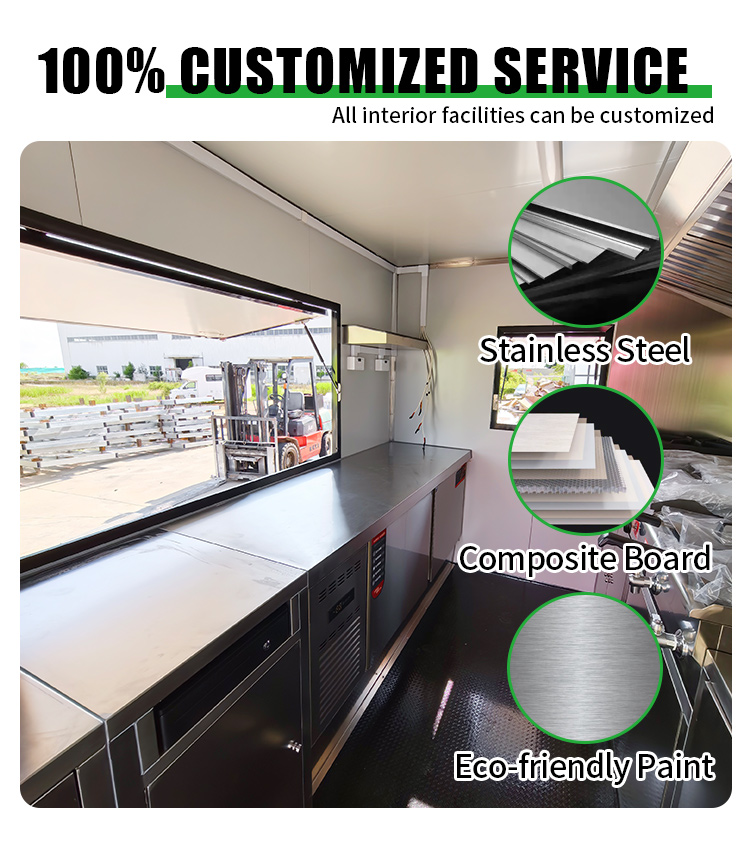 Our food trailer uses high-strength steel as the floor, with double layers of galvanized steel inside and outside: 1. Widen 185R 14C/165R 14C tires; 2. Equipped with mechanical braking system, hand brake and safety chain, which is sturdy and durable, and improves the Factor of safety of driving; 3. All stainless steel sliding door cabinet workbench, 304 # high-quality stainless steel material, double layer workbench, more sturdy; 4. We can meet the water system regulations of different countries. The standard configuration is 2 water tanks, 2+1 water tanks in the European market, and 3+1 water tanks in the United States; 5. The exterior is made of beautiful composite board material (fiberglass is optional). We can create stickers to help you promote your brand!